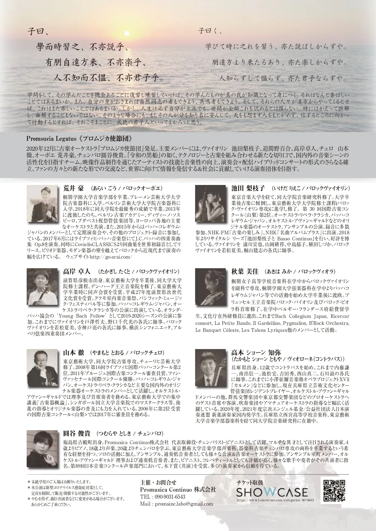 私共は、"Promusica Baroque Academy" 古楽オーケストラ『プロムジカ使節団』と申します。2020年12月にチェンバロ・通奏低音奏者の圓谷俊貴により創設されたアカデミックでプロフェッショナルな古楽団体です。
