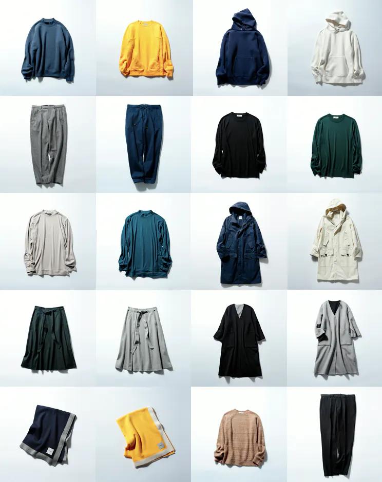 どのアイテムも、長く使っていただけるよう、トレンドに左右されないデザインで、生地や縫製にもとことんこだわってつくっています。中でも、1時間に1メートルしか編むことの出来ない、世界でも希少な機械で編み上げた”吊り裏毛"を採用したスウェット生地は、特注の厚さで打ち込んだ後に、製品洗い+自然乾燥を2回行っているため、型崩れや、色落ちの心配がありません。