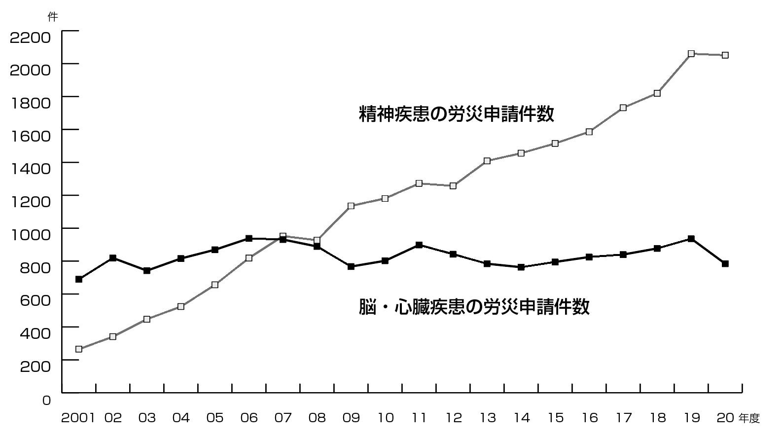 この被害が年々増加しています(図表1)。厚労省が発表している、業務による精神疾患の労災申請件数に着目すると、2019年度には2000件を超え、2008年からの11年で2倍以上、2001年からの18年で約8倍にまで激増しました。脳・心臓疾患の労災申請の件数は700〜900件あたりで高止まりし続け、2019年度には936件と1000件に迫る勢いです。