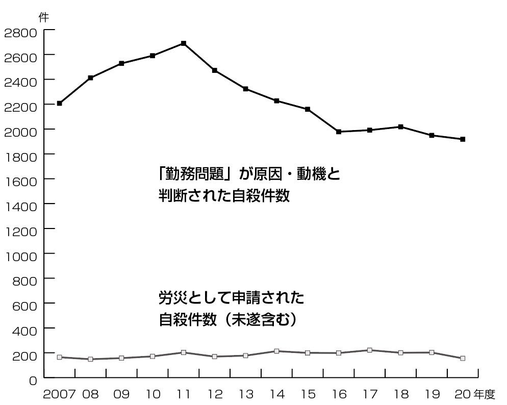 いったい、労災申請ができないまま埋もれてしまった被害事例がどれだけあるのか、全体像を把握することはできません。ただし、労働問題によって自死した人についてはデータがありますので、目安を示すことはできます。厚労省「過労死等白書」の最新版から「申請率」をざっくりと推測してみましょう(図表2)。警察が自殺者のうち「勤務問題」を原因・動機の一つとして判断した件数と、自殺(未遂含む)のうち労災が申請された件数を比較してみます。