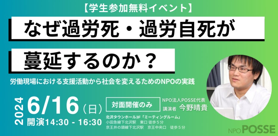 2024/06/09 14:02■イベントの内容:自分の家族や、通っていた中学や高校の先生の働き方を見て、「いつ家に帰るのだろうか」「いつか身体を壊してしまうのではないか」と心配になったことはないでしょうか。 日本は、世界有数の「長時間労働大国」です。国の統計によると、30〜40代男性の約10%が、過労死ラインを超えて働いています。中学教員に至っては、36%が過労死ラインを超過しています。当たり前のようにはびこる、命を脅かすほどの長時間労働。そうした中で、実際に過労によって命を落とす、あるいは自死を選択してしまう人も後を絶ちません。 最近では、2021年に、福岡市の小学校教員の40歳男性が、病休や産休した教員の担任も代行し、月100時間の残業が続いた末、ある日自宅でシャワーを浴びている時に突然心臓病を発症し、そのまま亡くなりました。2人の幼い子供を残しての突然の死でした。市を訴えた妻は「夫は亡くなる直前、顔色が悪くとてもきつそうにしていました」「目の前の子どもたちや職員のみなさんに迷惑がかかると考え、結果的に自分の心や体を犠牲にせざるを得ない状況に追い込まれていました」と、教員の過重労働の実態を訴えています。 また、2022年には、医師として甲南医療センターに勤務していた高島晨伍さんが100連勤・200時間以上の時間外労働の末、精神疾患を発症し26歳の若さで自殺へと追い込まれました。前年に同じ病院の若手医師ら5人が過重労働を訴えていたにもかかわらず、病院側は「半分は勉強やん、自分を鍛えるための」とあしらい、改善を拒んだ末に起こった事件でした。残された遺族は「『優しい医師になりたい』と照れた晨伍の笑顔が忘れられません」「センターにとっては医師の代わりはいくらでもいるのでしょうが、家族にとっては泣いて笑って大切に育てた、かけがえのない宝物なのです」と胸の内を訴えました。 労働者の命を奪い、遺族から唯一無二の大切な家族を奪う過労死・過労自死は、国が認定しているだけで毎年150〜200件起こっています。なぜ、日本社会ではこれほど過酷で、時に命すら落とすような異常な働き方が蔓延しているのでしょうか?このイベントでは『ブラック企業』の著者であり、過労死問題の最前線で遺族支援や社会発信に取り組んでいる今野晴貴・POSSE代表を講師に、命を奪う長時間労働が日本で「当たり前」になってしまっている背景、国の「過労死等防止対策推進法」や「働き方改革」が推進されてもなお過重労働がなくならないのはなぜかを解説します。また、イベント後半では、家事労働者として6日間、24時間休みなく働いた末に亡くなった女性の労災認定を求めて裁判を起こしている遺族の方に発言をしていただきます。 なぜ長時間労働や過労死は無くならないのか知りたい、日本の「異常」な働き方を変えたい、という方のご参加をお待ちしています。■こんな人におすすめ・日本社会の労働問題の現状を知りたい・労働・貧困問題に取り組む力を身につけたい・社会問題の解決に向けたNPOの活動に関心がある■日程:6月16日(日曜日)14時30分から16時30分 開場:14時■スケジュール14時 開場14時30分 開演・今野代表講演15時30分 遺族発言15時50分 質疑応答16時10分 POSSEの活動紹介・ボランティア紹介16時30分 終了■開催場所:北沢タウンホール3階 ミーティングルーム〒155-8666 東京都世田谷区北沢2-8-18小田急線下北沢駅東口 徒歩5分京王井の頭線下北沢駅京王中央口 徒歩5分■講演者プロフィール今野晴貴NPO法人POSSE代表理事NPO法人POSSE代表。年間5000件以上の労働・生活相談に関わり、労働・福祉政策について研究・提言している。近著に『賃労働の系譜学 フォーディズムからデジタル封建制へ』(青土社)。その他に『ストライキ2.0』(集英社新書)、『ブラック企業』(文春新書)、『ブラックバイト』(岩波新書)、『生活保護』(ちくま新書)など多数。流行語大賞トップ10(「ブラック企業」)、大佛次郎論壇賞、日本労働社会学会奨励賞などを受賞。一橋大学大学院社会学研究科博士後期課程修了。博士(社会学)。専門社会調査士。X(旧Twitter)アカウント:@konno_haruki■NPO法人POSSEとは? POSSEは、若者の労働・貧困問題が深刻化していた2006年に当時大学生だった今野晴貴らによって結成され、これまで数多くの問題に取り組んできた。現場の労働相談から「ブラック企業」を社会問題化し2013年には「流行語大賞」と「大佛次郎論壇賞」を受賞した。また、宮城県仙台市にて被災地支援をおこない厚生労働大臣から感謝状を受領した。近年では、コロナ禍で困窮する女性や外国人の問題にも積極的に取り組み2021年に「第8回エクセレントNPO大賞」を受賞した。www.npoposse.jpボランティアも募集しています!POSSEでのボランティアに関心がある方は下記よりお問い合わせください。https://possevolunteer.tumblr.com/ もっと見る