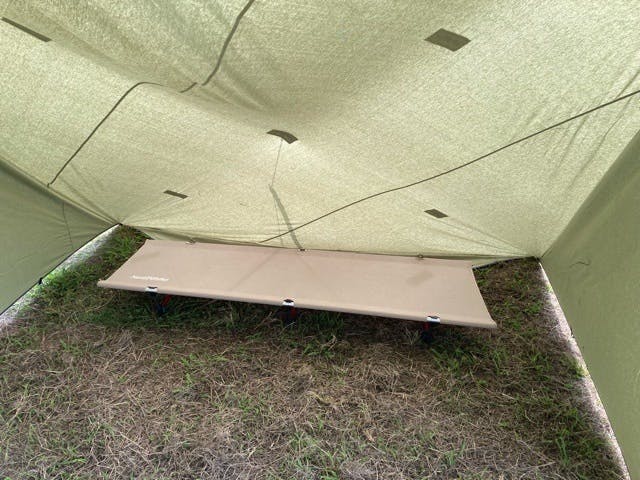 コットン生地は夏でも遮光性高く影が濃いので快適にタープ下で過ごせます。