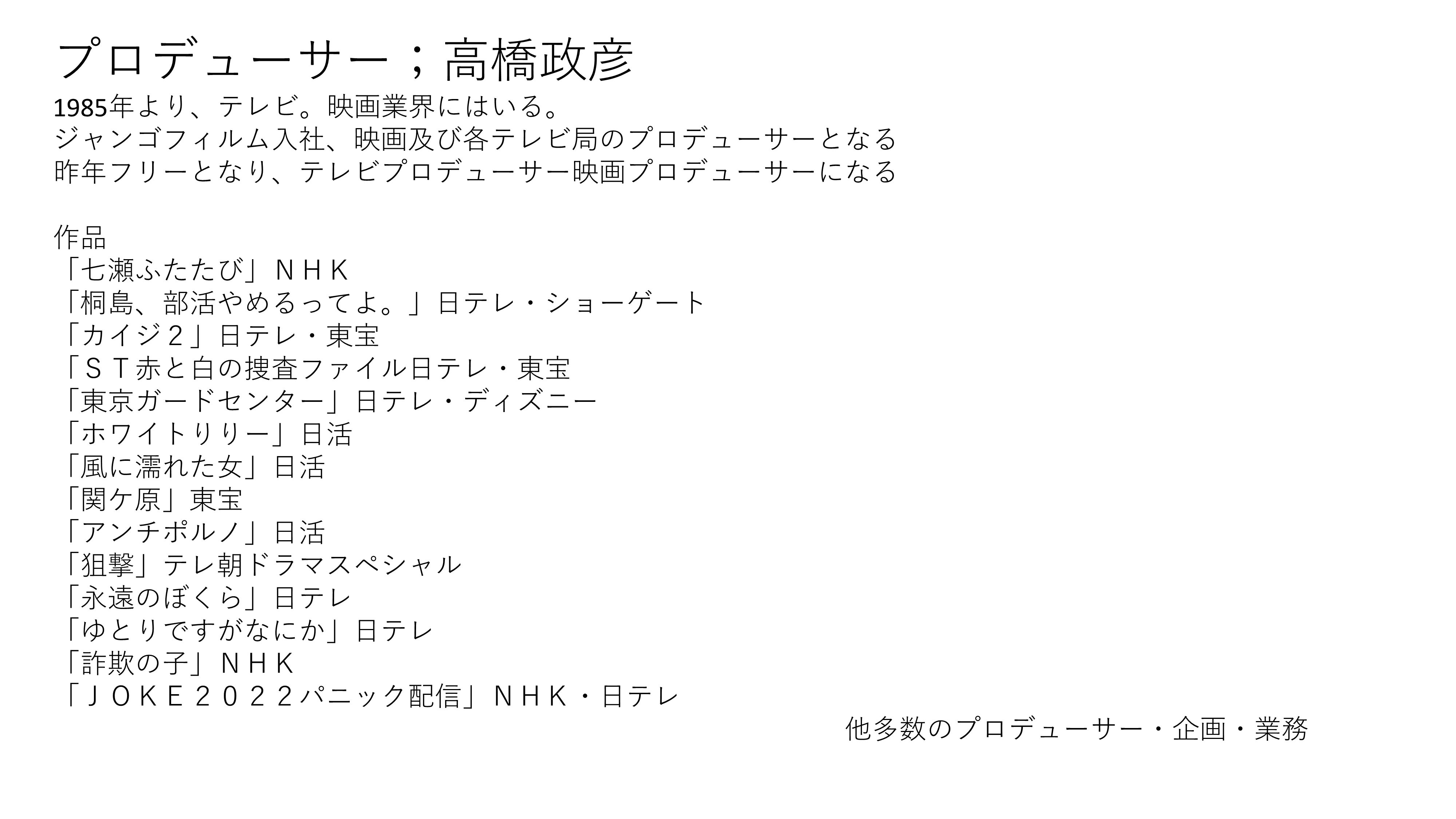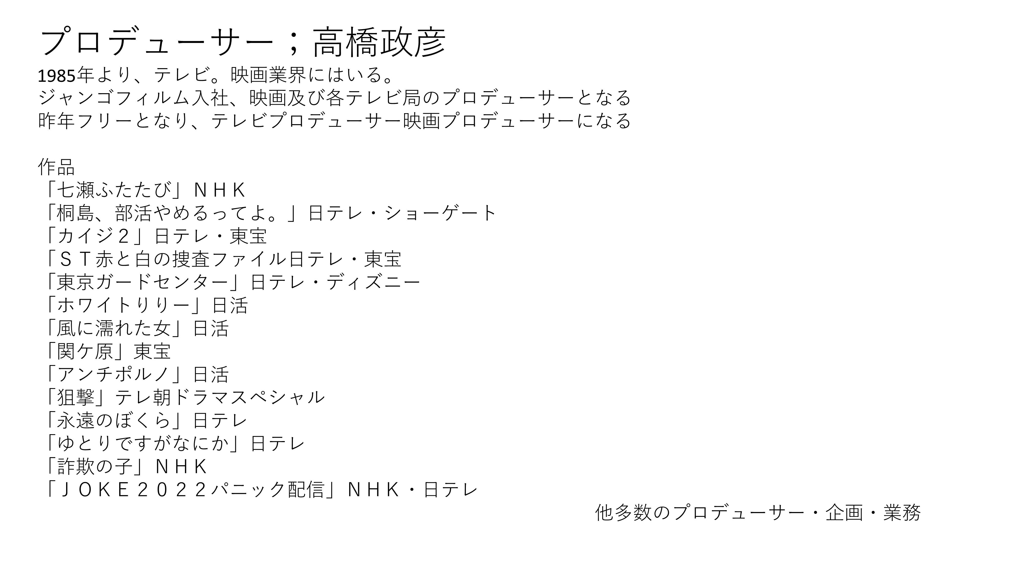 「女子硬式野球物語製作委員会プロデューサー・幹事 高橋政彦 私は3年前まで映画会社日活に在籍しておりました。在籍中より”女子硬式野球”の企画を立ち上げ。コロナにより延期と予算の変動がありましたが。全日本女子硬式野球連盟とタッグを組んで、現在進行中です
