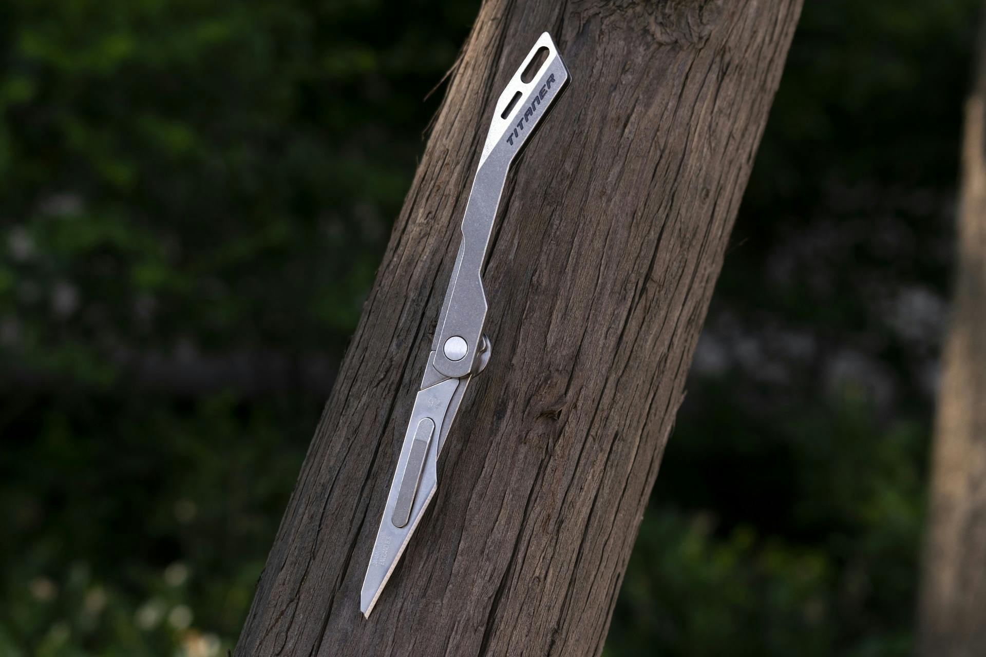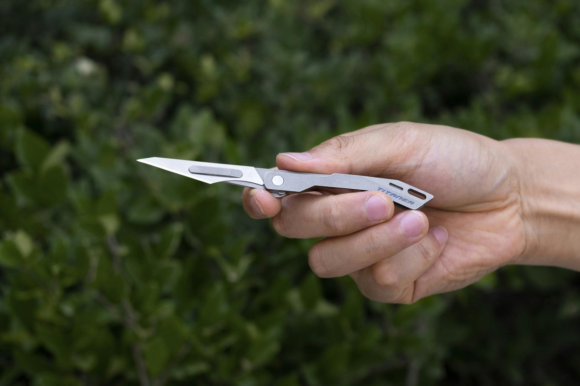 チタンを採用することで、ボディの強度と耐久性を同時に高め、大幅な軽量化を実現しています。 そして、このナイフは、#23 #24 #25 #26 #18 #36と、安価で耐久性があり、切れ味が良く、刃の交換が可能な異なる刃に対応しています。