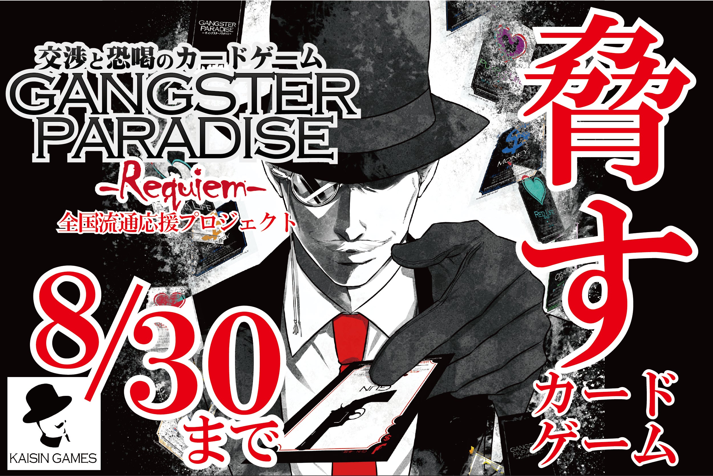 交渉と恐喝のカードゲーム、ギャングスタ―パラダイスを再販したいと思っております。今回、今までの問題点を改善し調整した形になりますので、名称も変更し、「GANGSTER PARADISE Requiem(ギャングスタ―パラダイス レクイエム)」と名付けております。