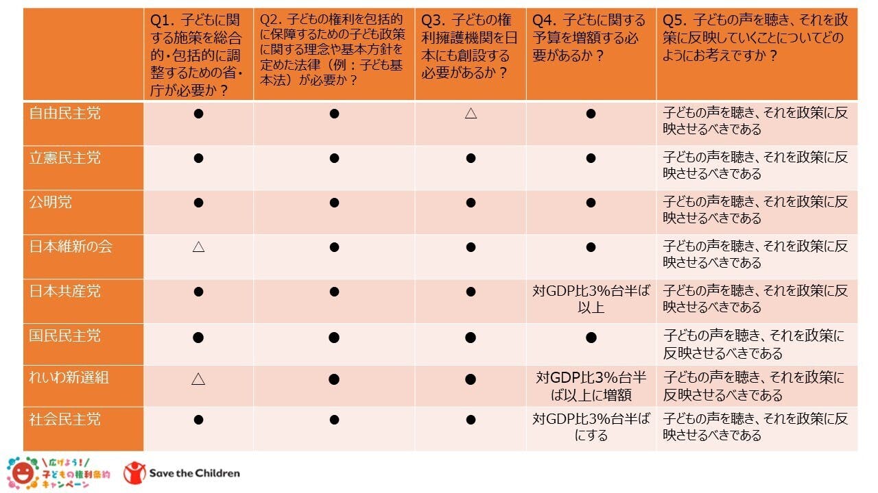 2021年10月31日の衆議院議員選挙「広げよう!子どもの権利条約キャンペーン」(以下、キャンペーン)では、その実行委員団体であるセーブ・ザ・チルドレン・ジャパンが中心となって、各政党がどのような方針で子ども政策について取り組むのかについて、政党アンケートを実施しました。