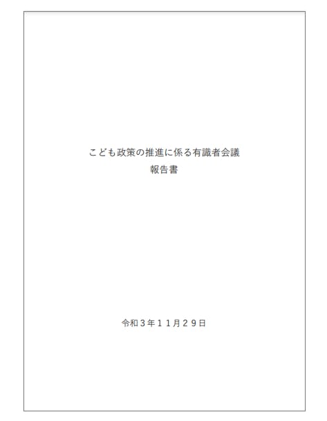 内閣官房において「経済財政運営と改革の基本方針2021」に基づき、子どもを産み育てやすい環境の整備を加速化するとともに、子どもの命や安全を守る施策を強化し、子どもの視点に立って、子どもを巡るさまざまな課題に適切に対応するためのこども政策の方向性について検討を行う「こども政策の推進に係る有識者会議」が、昨日11月29日に、「こども政策の推進に係る有識者会議」の報告書をまとめ、岸田首相に提出しました。