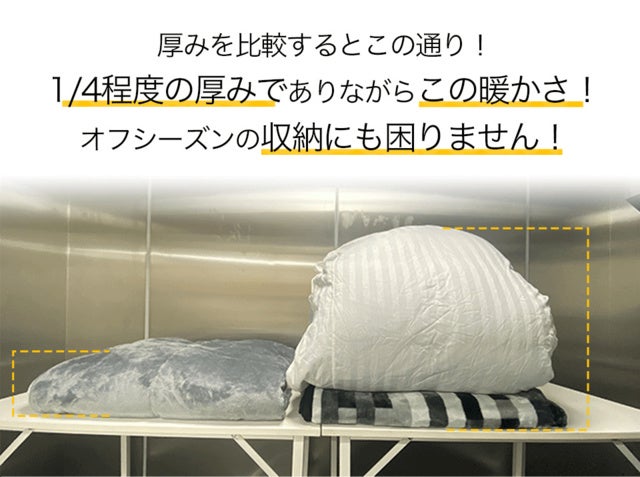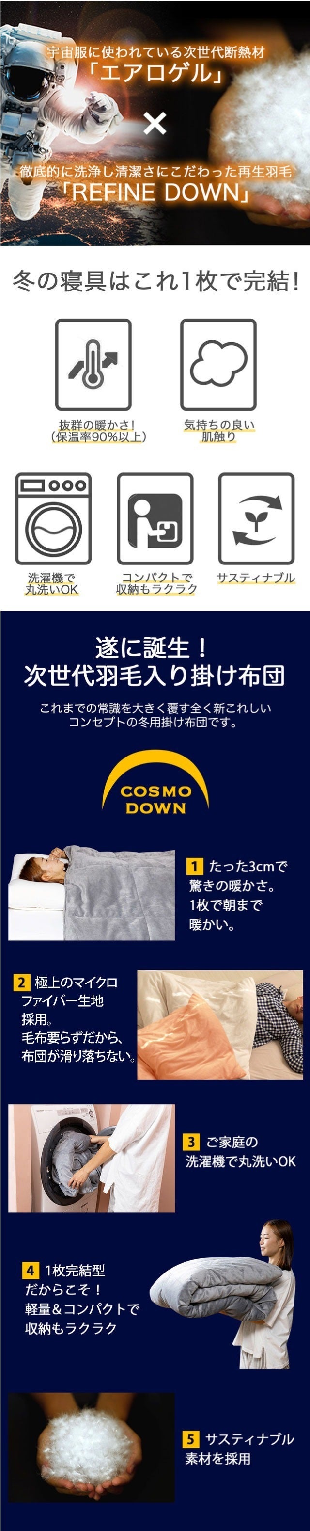 羽毛布団、毛布、カバー等々冬の布団はどうしてもかさばってしまい、オフシーズンの収納や出し入れが大変ですが、COSMO DOWNは1枚で冬の寝具が完結し、およそ1/4程度の省スペース性も実現するので、収納や気温に合わせての出し入れもラクラクです。