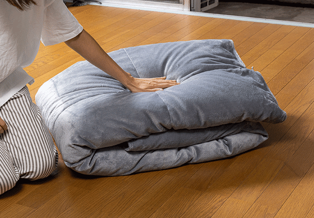 A. 中わたには羽毛を入れているため空気を含んだ状態で測ると、3cm以上の厚みにはなりますが、空気を押して抜いていただけましたら、厚み約3cmの薄さになります。