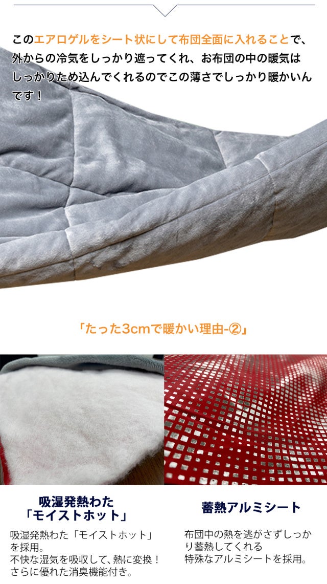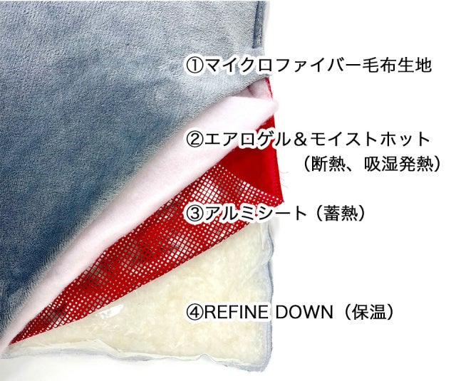 厳選した素材と理にかなった構造によりたった約3cmの薄さでありながら圧倒的な暖かさを実現!