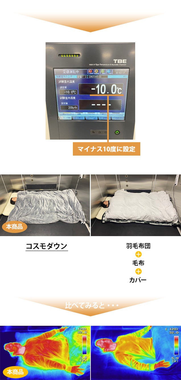 極寒の真冬を想定したマイナス10度の過酷な環境下で、COSMO DOWNと比較品(羽毛布団+毛布+カバー)で寝た時の体の表面温度をサーモカメラで測ってみると、、