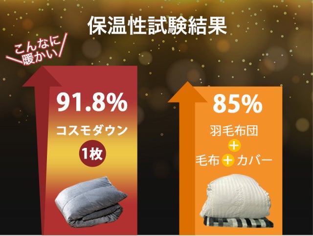 なんと! 羽毛布団+カバー+毛布よりも本商品1枚の方が暖かいという試験結果も!