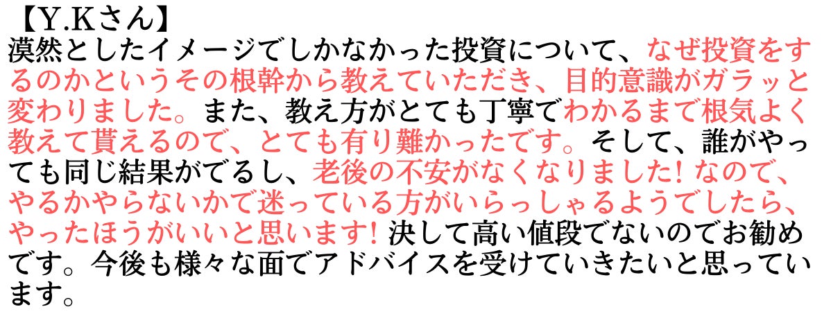 私が経験した限りでは、受講した人が本当に資産を増やすことができるノウハウを提供している会社は、一つもありませんでした。高い金額を払ったのに、それに見合う価値が提供されない。「詐欺」まがいの商品販売に、大きな憤りを感じていました。