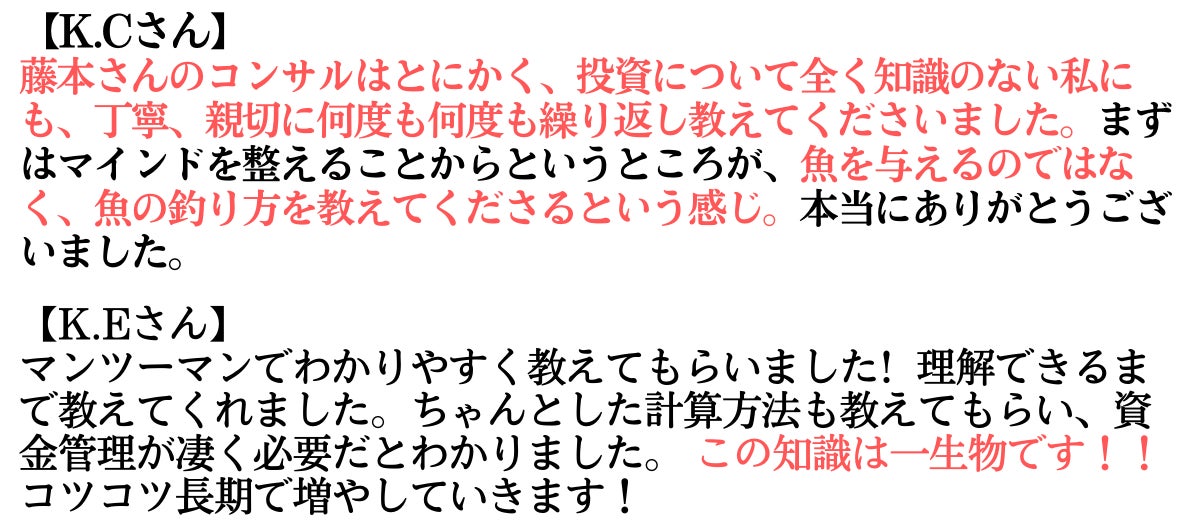そうした方には、90分のコンサルをご用意しています。ここで、お金の知識、副業や投資の基本的な知識、モチベーションのあり方や生活習慣を変えるための秘訣など、資産運用に必要となる「基礎」をお教えしています。
