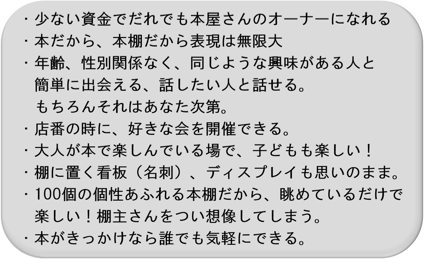 人件費はかけず、棚主さんでお店番(2~3か月に1回位)をして頂く、お店番がいない時は営業しない、などシェア型本屋さんスタイルを楽しんで頂ける方、