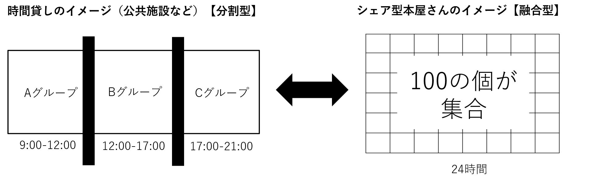 「公共施設、レンタルスペースや劇場ホールで表現の場があるのでは?」と思う方もいらっしゃるかも知れません。確かに予約をすれば借りられます。しかし、個人やグループが“時間で分割して場所をシェア”していて、図書館も本を時間貸ししているといえます。一方、シェア型本屋センイチブックスでは、常駐しているそれぞれの本棚は個のチャネルを自由に発信し続け100の多様な世界が広がる一つの空間を創ります。“分割”ではなく“融合”なのです。