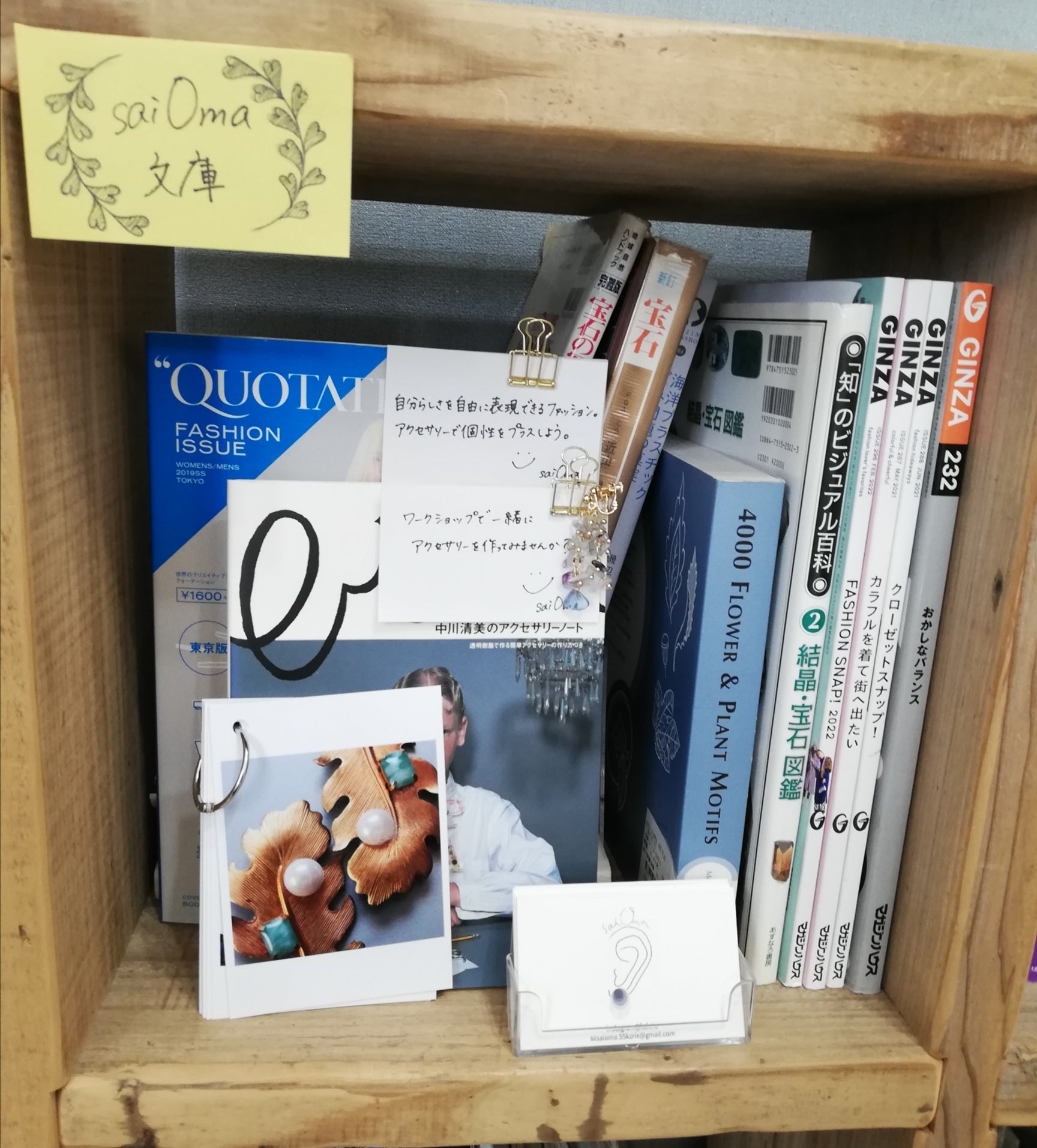 ファッションや宝石、ジュエリーの本からアクセサリーを連想してもらったり、ハンドメイドの本からWSに興味を持ってもらう事もできる。販売の際、プラ包装を避けている事、代金の一部を寄付している事もあり、地球環境に関する本も置ける。等、よく考えると様々なアプローチが可能で、無限に広げられるのではと感じた。