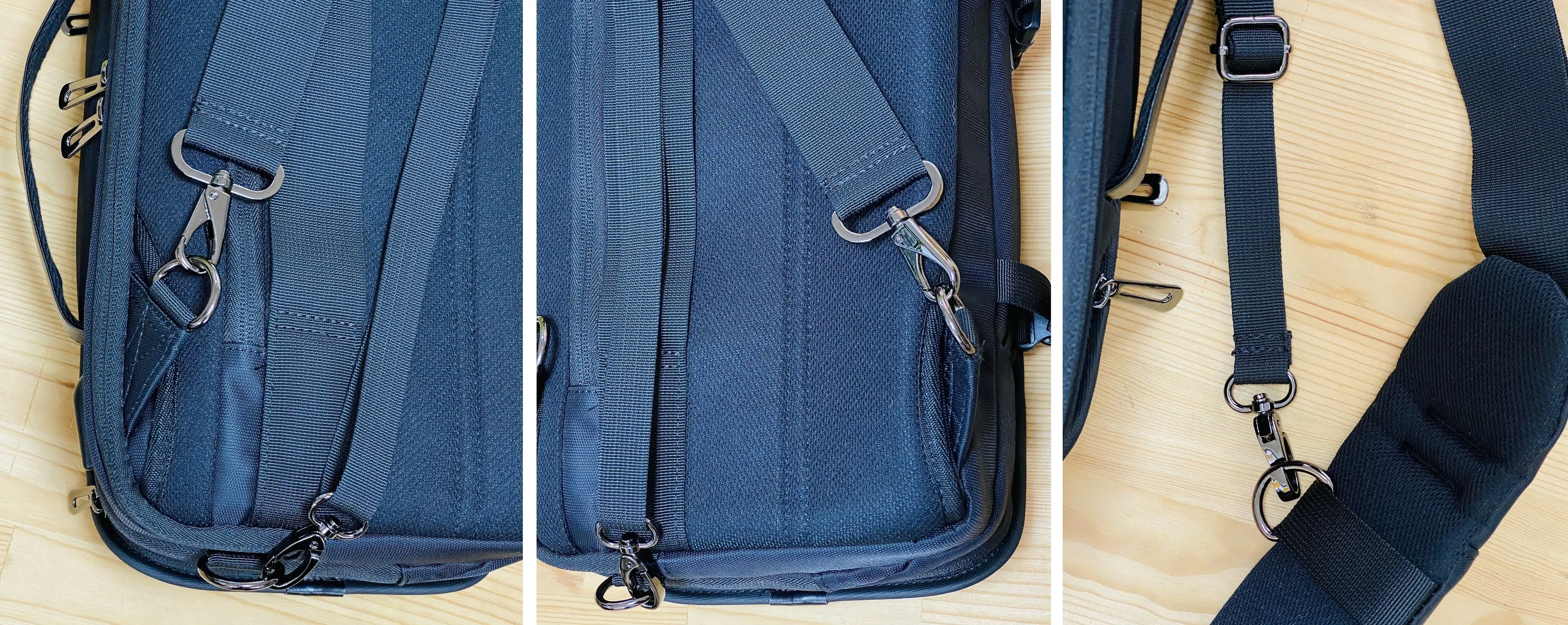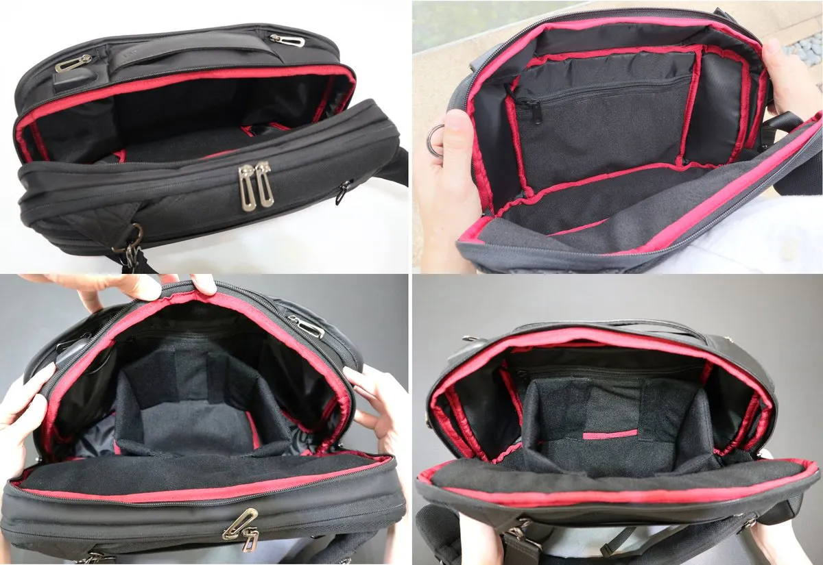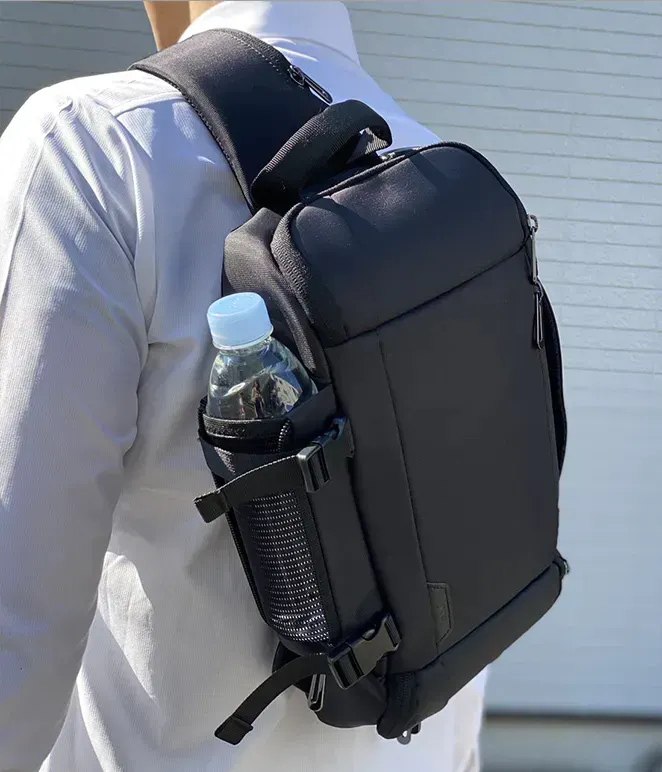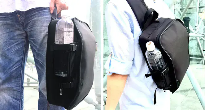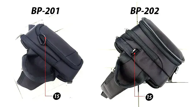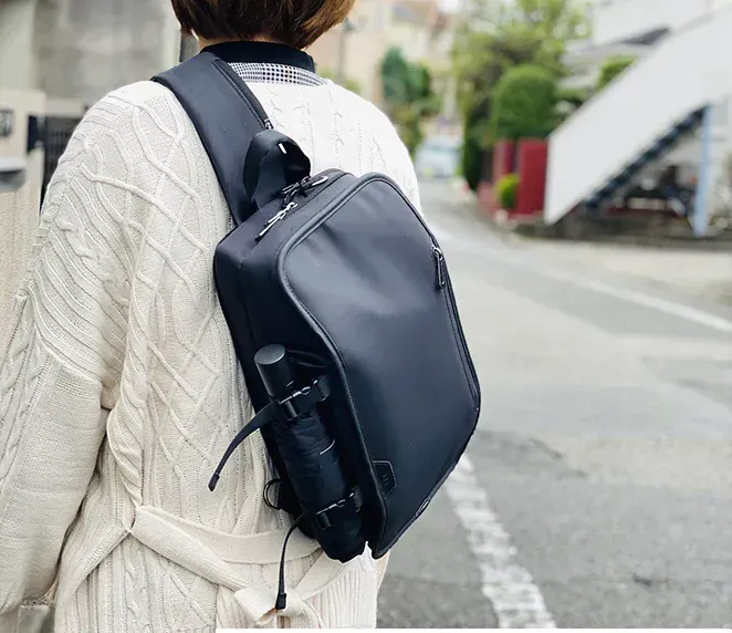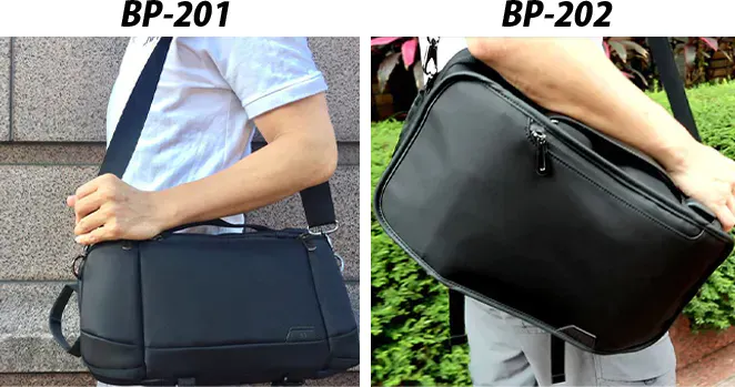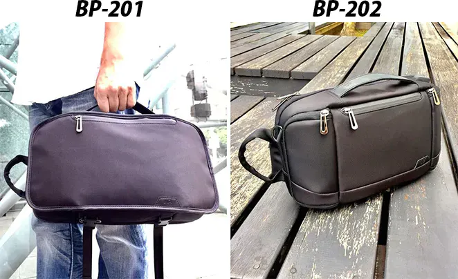 A:BP-201とBP-202は、「軽量」「形」「収納性」をコンセプトにデザインされ、ショルダーバッグの周りの専用ポケットで日常的に取り出すものをすばやく簡単に取り出せるように設計されています。