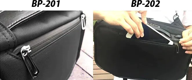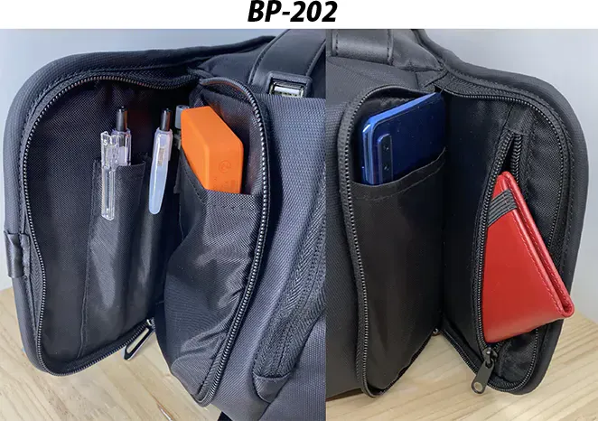 バックの背面には盗まれたくないものを収納できるポケット付。携帯電話/財布/パスポートなどを収納できます。(BP-202、BP-201共通)