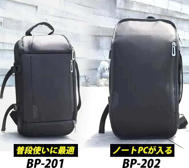 BP-202は収納スペースが多いのが特徴なので、お仕事などでノートパソコンを持ち歩く人、普段の荷物が多めの人にお勧めです。どちらでもいい人は、デザインが好きな方を選んでもいいかもしれません。