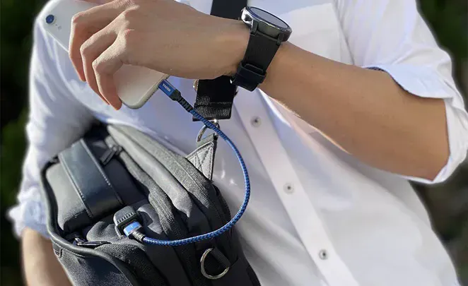 外部USB充電ポート付きで、バッグを開けなくても携帯電話を充電できます。(BP-202、BP-201共通)