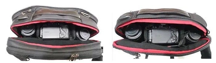 ▲カメラ収納例(キヤノン600D、レンズ2枚[頂8cm、高さ13cm])を収納。