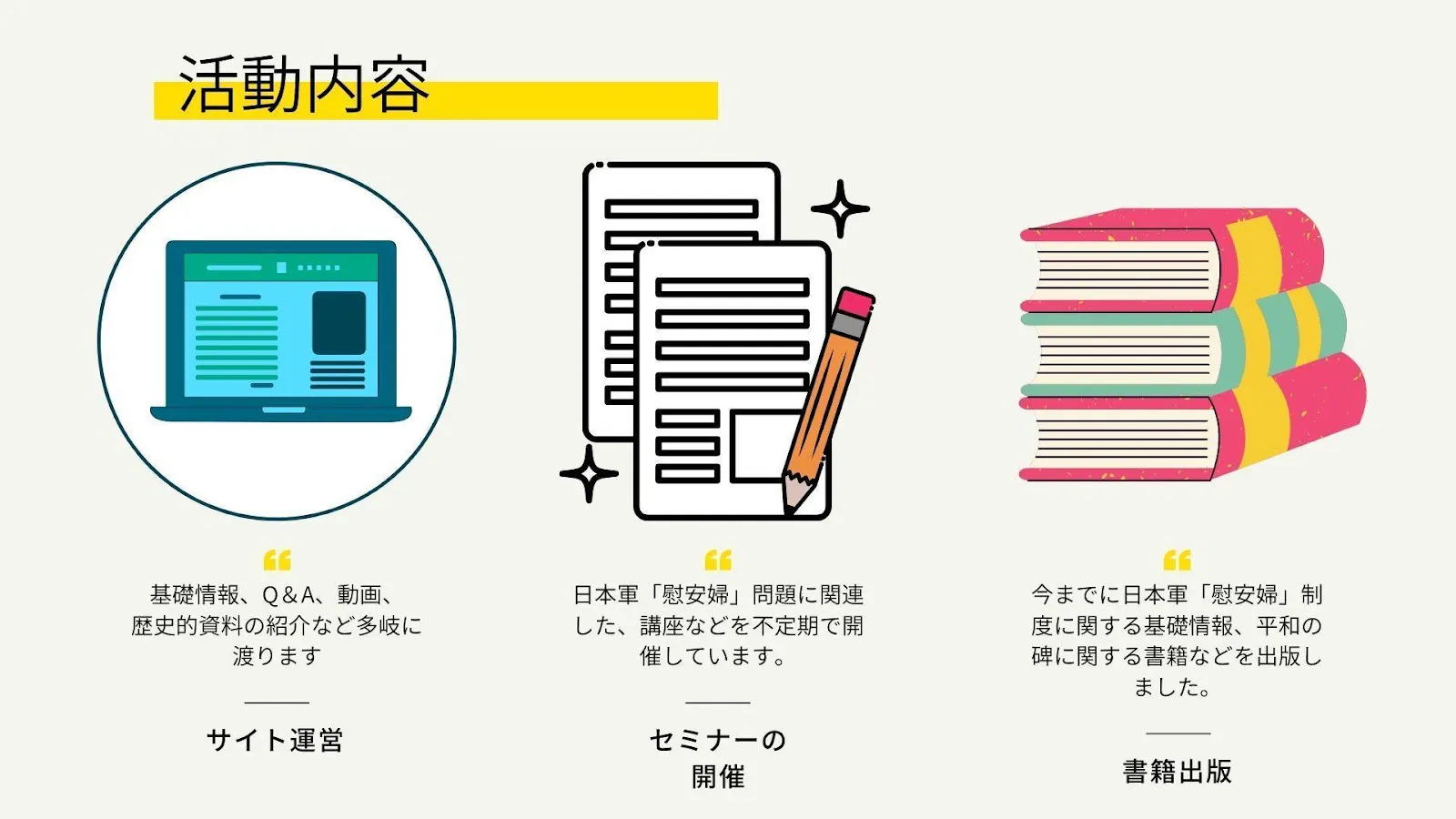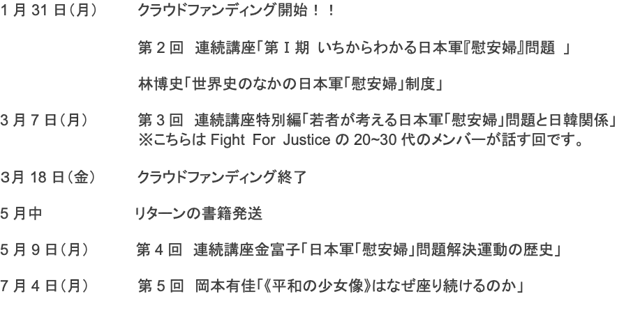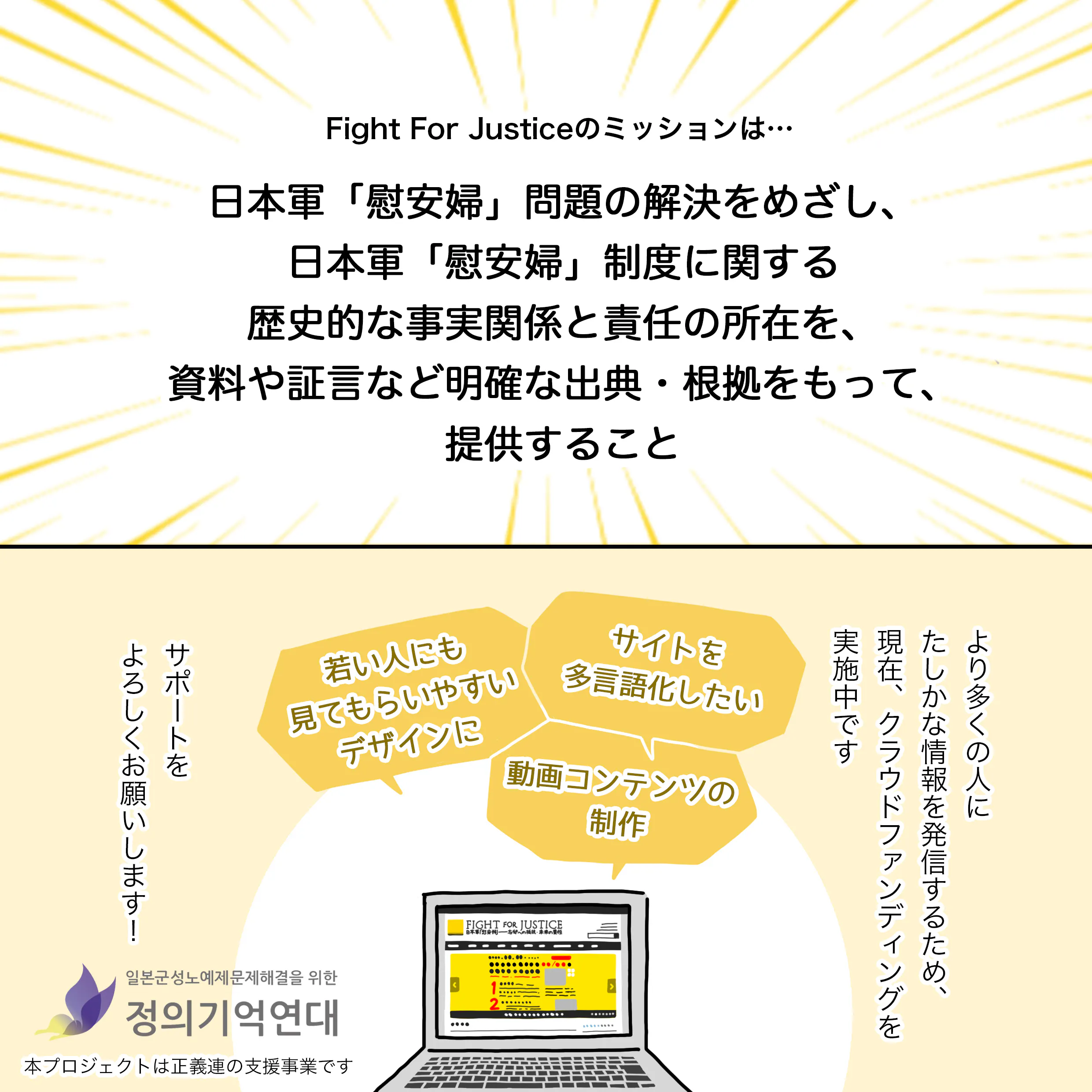 現在日本においては日本軍「慰安婦」問題に関してメディアやネットにおいて正しくない情報が多くあがっています。そのようなヘイトスピーチを含む言説に対抗することは人権を守ることであり、社会にとって非常に重要なことだと思います。より多くの人に正しい情報を知り、学んでもらうためどうかご支援のほどよろしくお願いします。