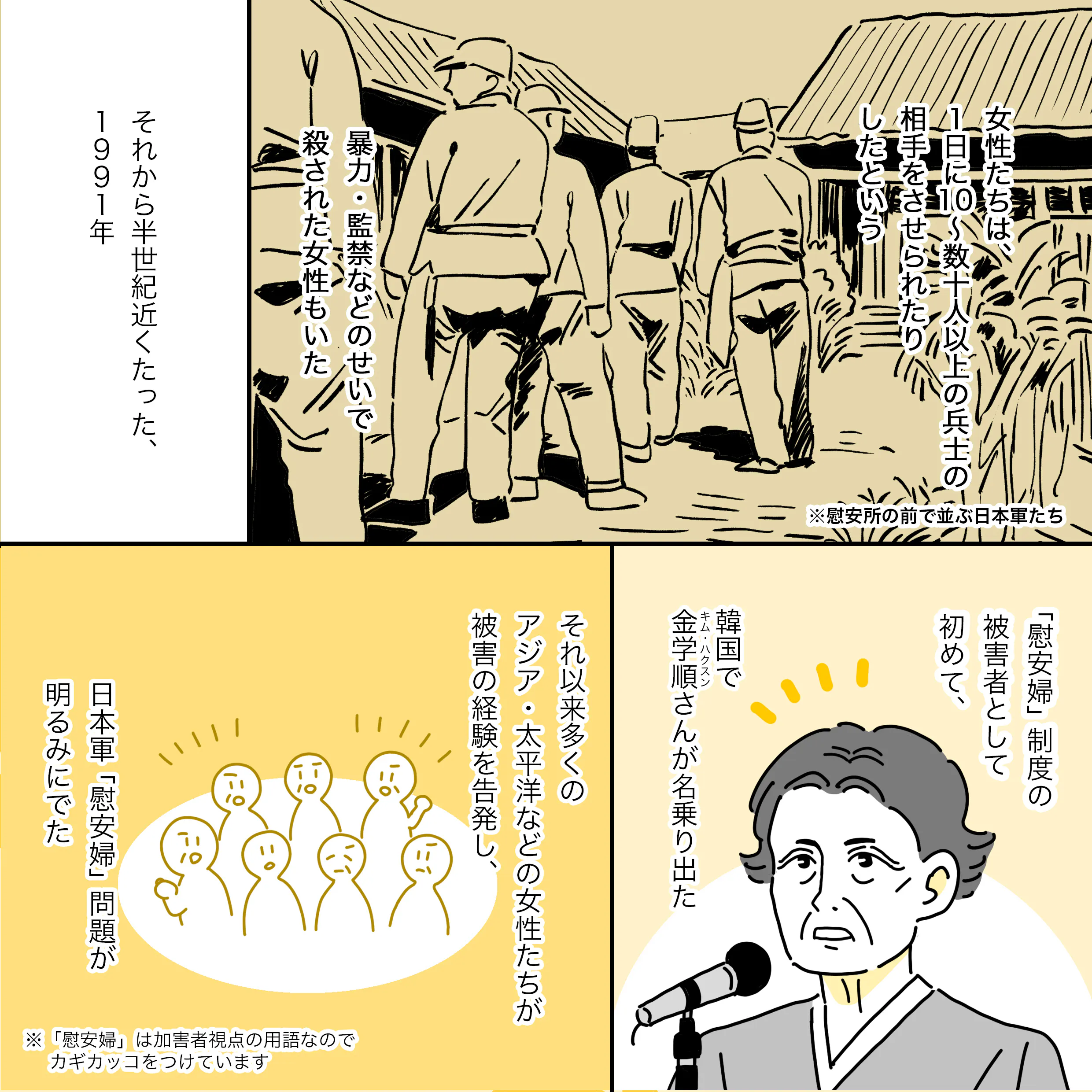 ニュースなどでは日韓の外交問題のように扱われているけれど、日本軍「慰安婦」問題は、当時の日本による植民地支配、レイシズム、女性差別、貧困の問題などが土台となって行われた、女性に対する重大な人権侵害なのです。