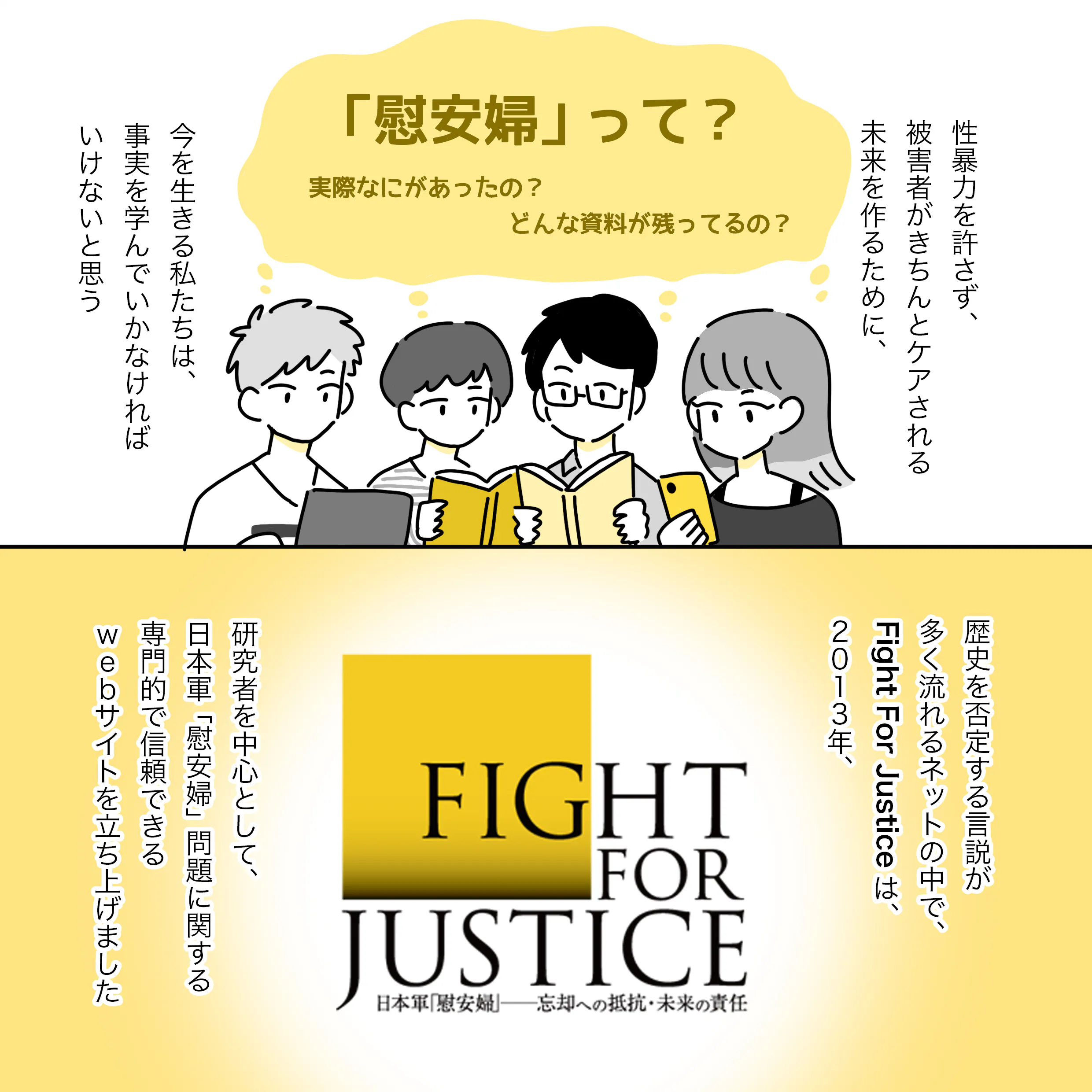 そう思った私たちは、2013年に”Fight for Justice : 日本軍「慰安婦」-忘却への抵抗・未来の責任”というサイトを立ち上げました(以下「FFJ」と呼びます)。