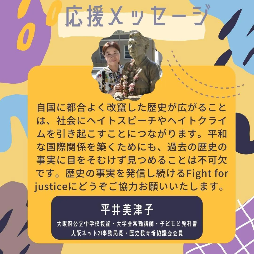 大阪府公立中学校教諭・大学非常勤講師・子どもと教科書大阪ネット21事務局長・歴史教育者協議会会員の平井美津子さんから応援メッセージいただきました!