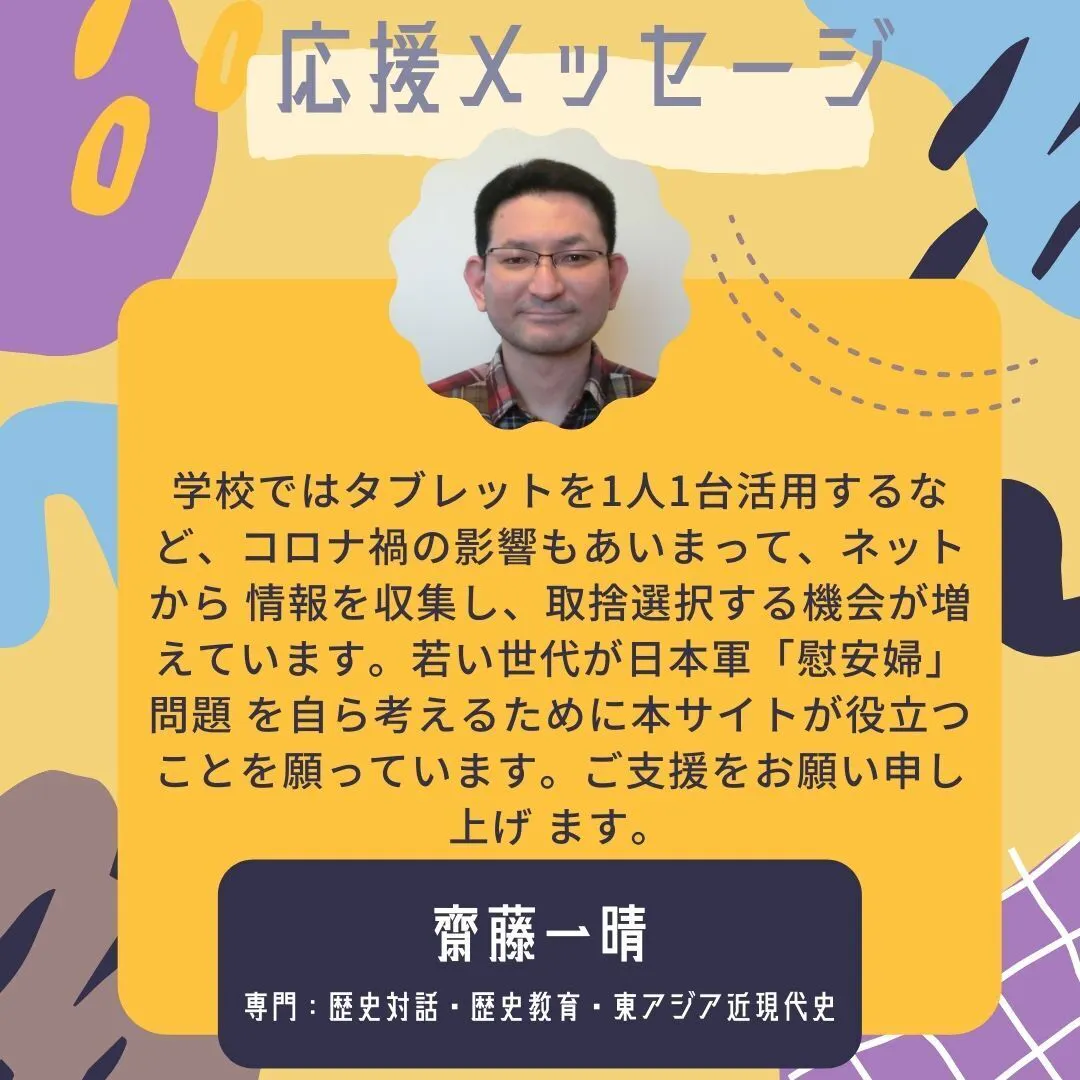 専門:歴史対話・歴史教育・東アジア近現代史の齋藤一晴さんから応援メッセージいただきました!
