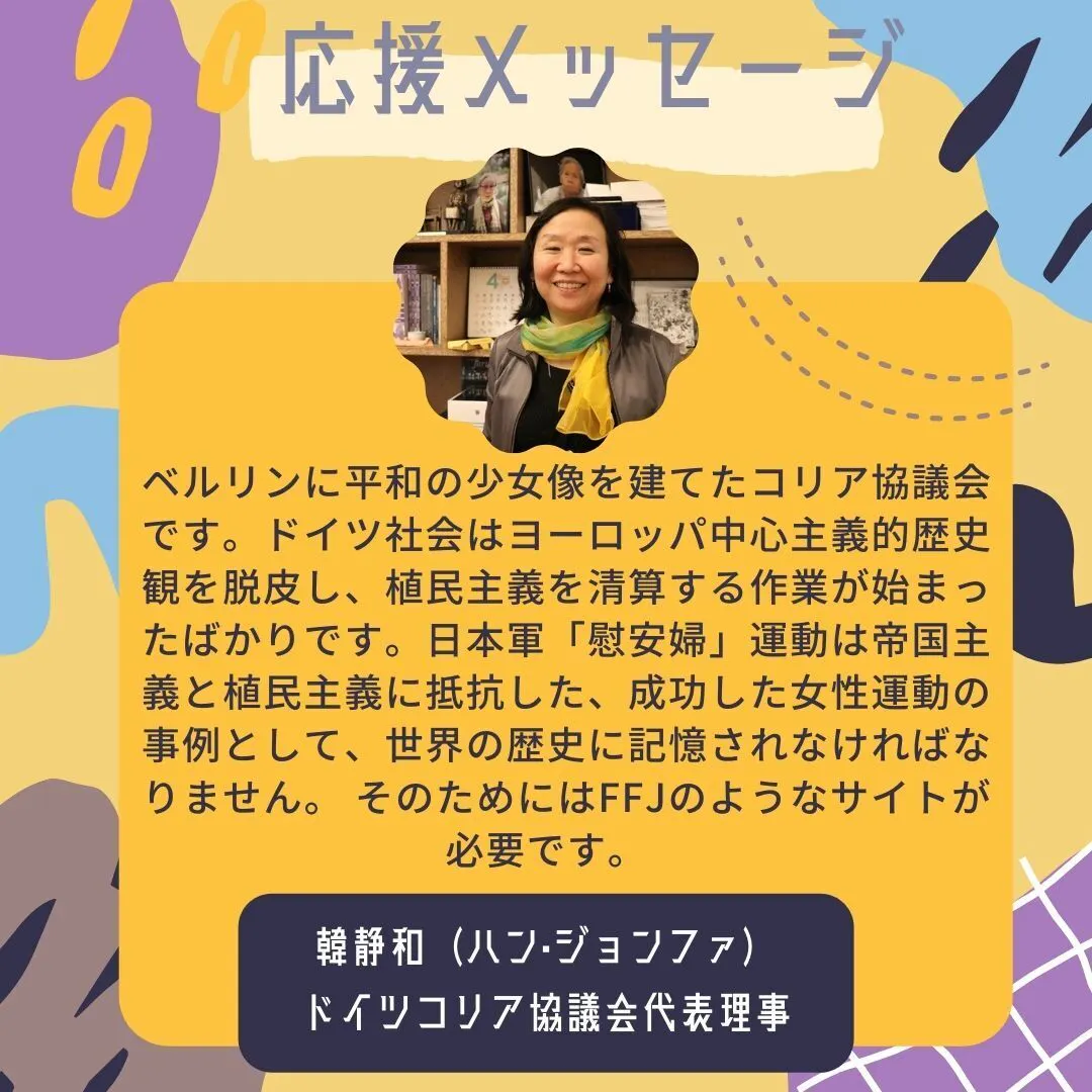 ドイツコリア協議会代表理事の韓静和(ハン·ジョンファ)さんから応援メッセージいただきました!