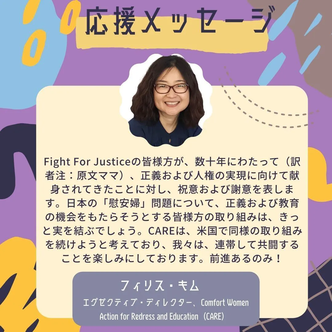 エグゼクティブ・ディレクター、Comfort Women Action for Redress and Education(CARE)のフィリス・キムさんから応援メッセージいただきました!