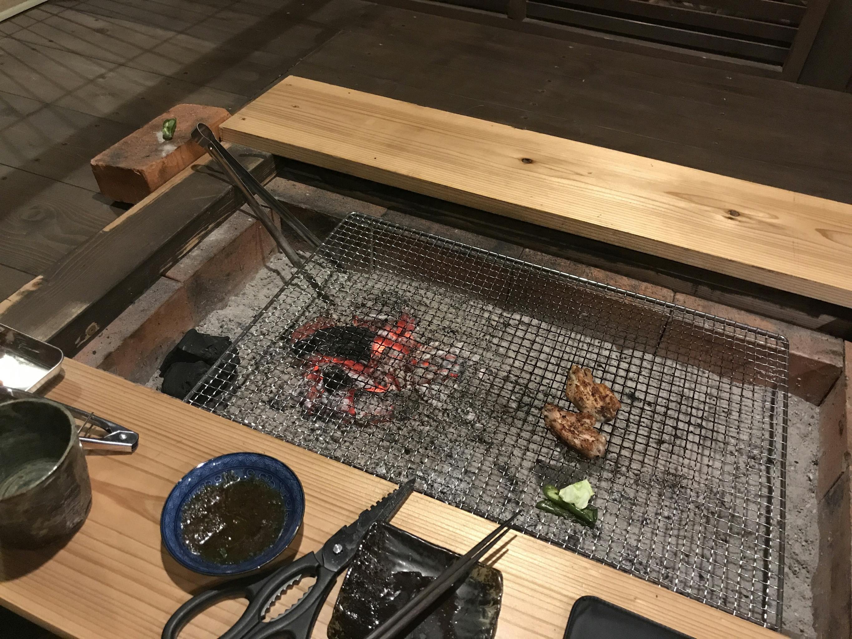 写真は、庵にある囲炉裏です。こちらで炭火を眺めながらお話しさせていただいております。