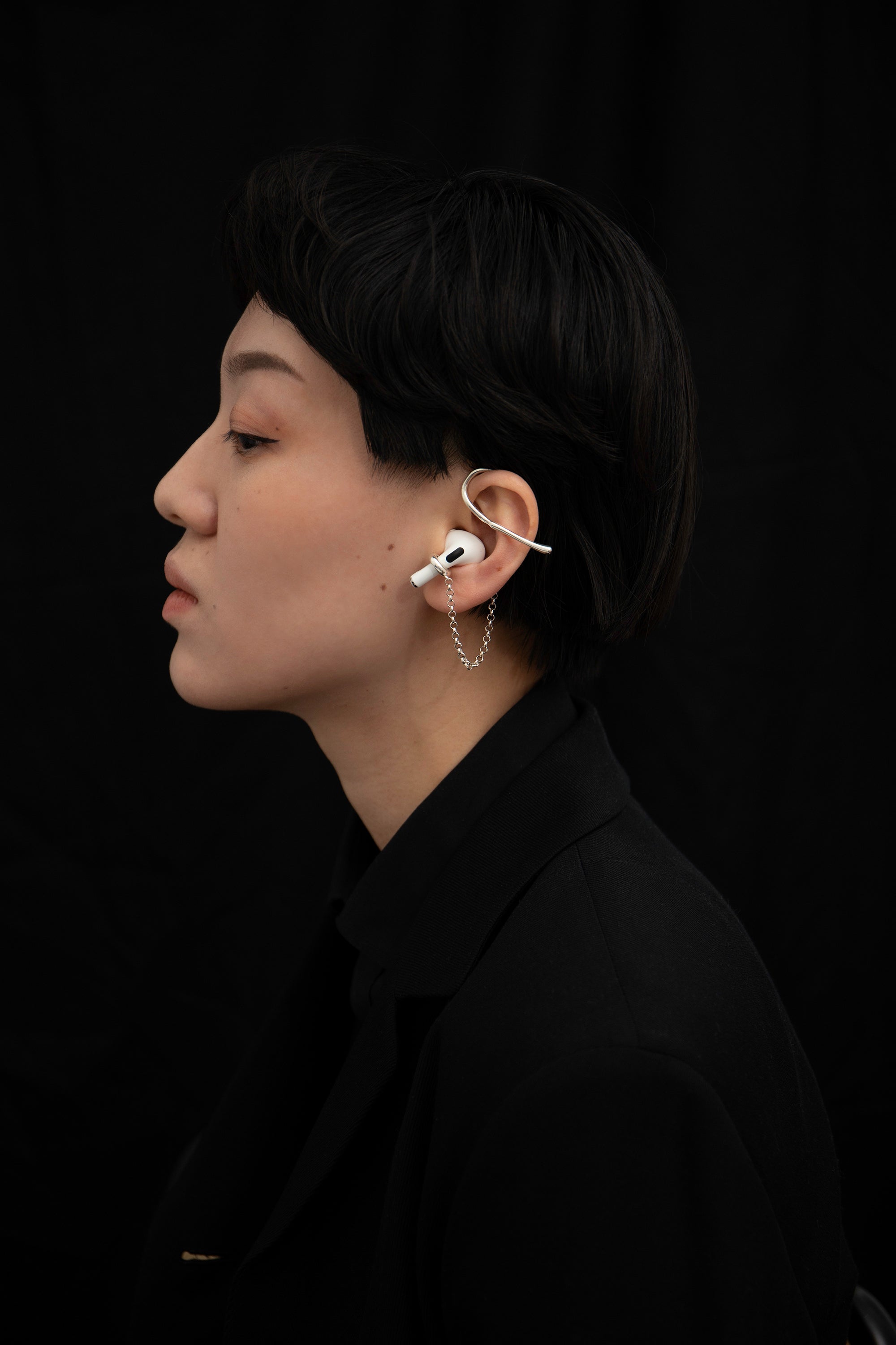 より知的な印象も感じられるPods Cuff。スターリングシルバー925とパールのコンビネーションにはガジェットもマッチします。Pods Cuff同様、あらゆる世代の方々に着用いただけます。アイウェア同様、イヤホンはこれからさらにファッション性が増し、用途も広がるでしょう。