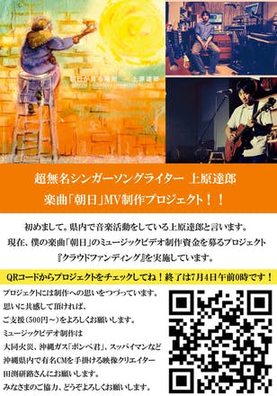 2016/06/06 22:46みなさん、初めまして!沖縄県内で音楽活動をしている上原達郎と言います。僕のプロジェクト『超無名シンガーソングライター上原達郎の楽曲「朝日」MV制作プロジェクト!!』もスタートして4日目。SNSで支援を呼びかけたり、メールで友人や知り合いに連絡したりなど、基本、インターネットを使って宣伝を続けてきましたが、ふと思いました。 「目標金額を達成するためには、もっと不特定多数の方々にプロジェクトを伝えなくちゃいけない」そう思った時に、ふとひらめきました!!フライヤー作ろう!こんな感じで。。。(とても雑ですが^^;)クラウドファンディングは口で説明するよりも、実際に見て読んでもらうほうが理解が早いので、QRコードを使えば、初対面の方、多くの方々にプロジェクトを読んでもらえると信じています。もちろん、フライヤーはばら撒きではなく、一人一人に丁寧に思いを伝えて渡さなくてはいけません。他にも良い宣伝方法が思いついたら、またご報告します! もっと見る