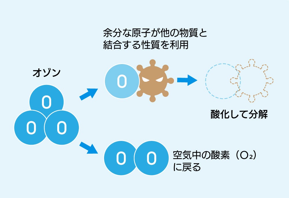 そのため、オゾンは菌やにおいの物質が近くにあると、酸素原子3つのうち1つを分離させて酸素(O₂)になろうとします。一方、菌やにおいの物質はオゾンの酸素原子と融合することにより酸化させられ分解されます。