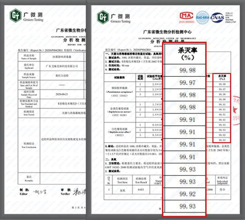 権威機関による殺菌認証試験結果。殺菌率や約99.9%