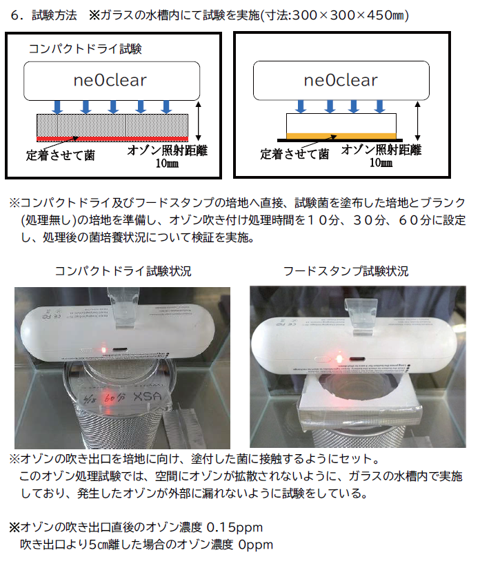 A.「ne0clear」のオゾンの発生濃度は20mg/㎡、すなわち0.02mg/Lなので人体の健康に影響はなく、安全です。また、オゾンは水や食品中に長期間存在しないので、残留することもありません。