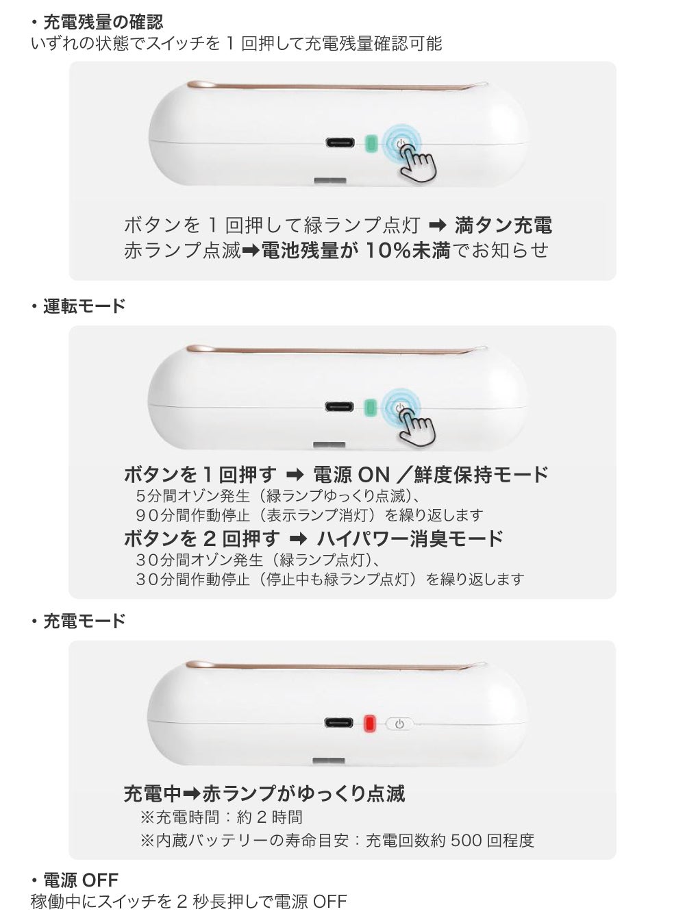 A.充電時間は約2時間です。「鮮度保持モード」で約20-25日間、「ハイパワー消臭モード」で約30時間ご使用出来ます。尚、充電残量が10%未満になった場合、赤色ランプが点滅してお知らせいたします。