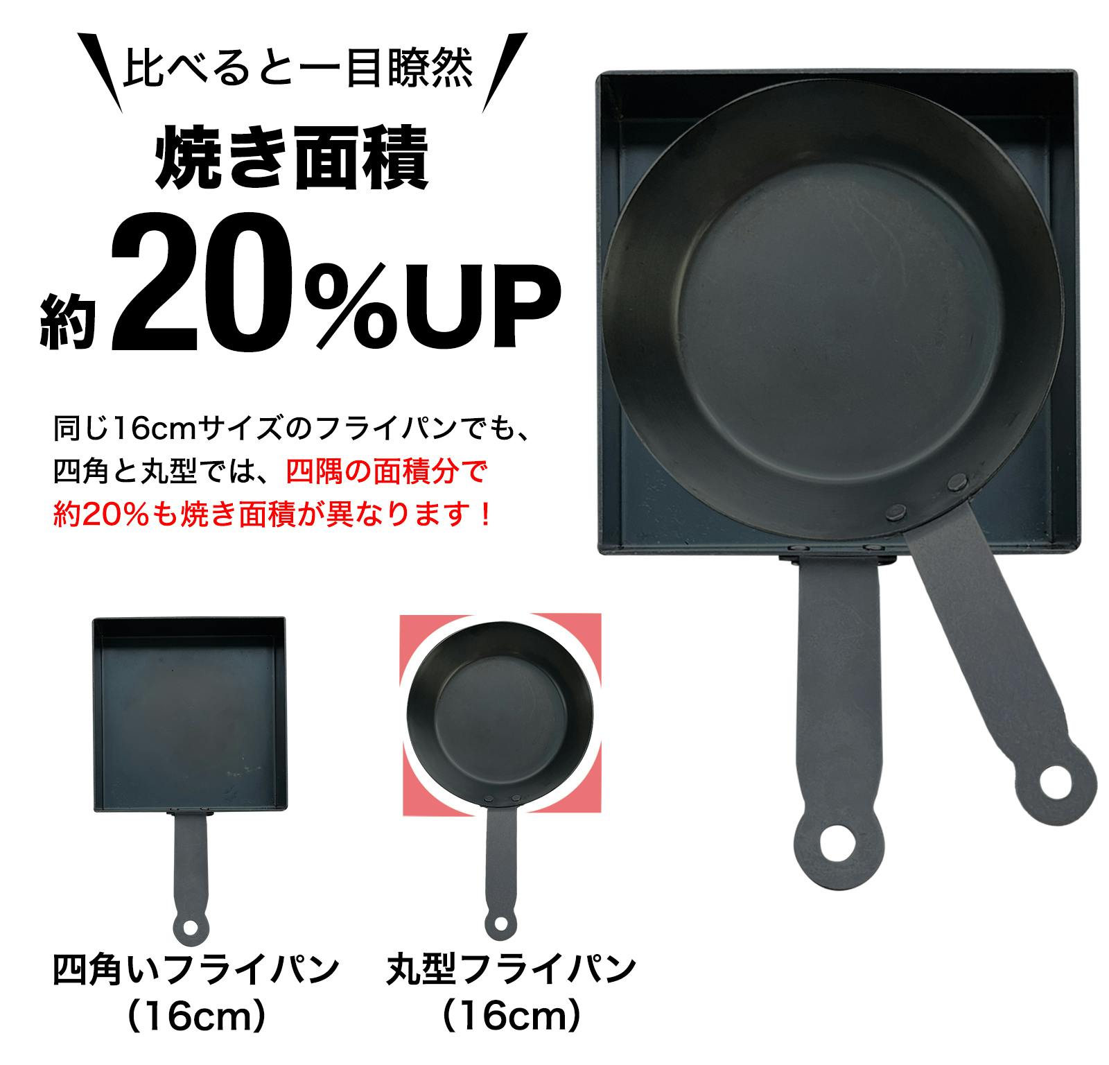 四角いので従来の丸型のフライパンに比べて焼面積も大きく、使い勝手も収納性も抜群なんです!