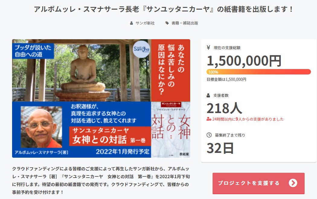 1週間前の12月9日からスタートした、アルボムッレ・スマナサーラ長老の著書『サンユッタニカーヤ 女神との対話 第一巻』のクラウドファンディングですが、