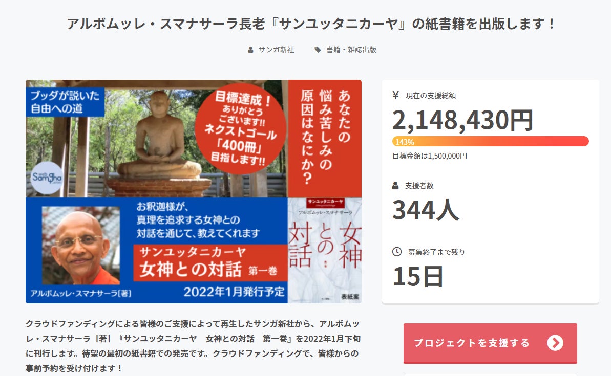 そして、12月9日からは、アルボムッレ・スマナサーラ長老の著書『サンユッタニカーヤ 女神との対話 第一巻』出版のためのクラウドファンディングを実施しております。
