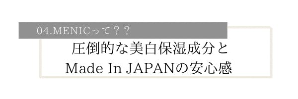 Menicは美白・保湿成分のボタニカルエキス13種類を配合し、完全Made In JAPANで