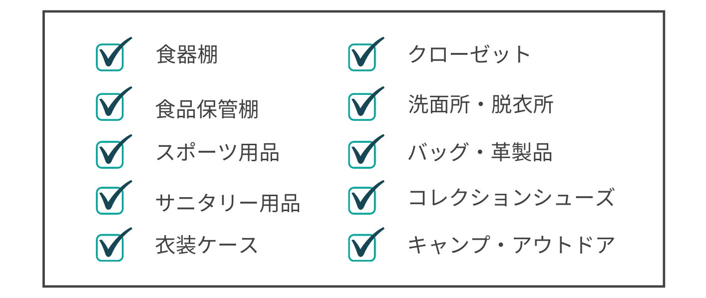 クローゼットの衣類、革靴、スニーカー、ブーツ、スポーツ用品など材質は問わず使用可能、バッグやグローブなど狭い空間のあらゆる品も強力に除湿します。