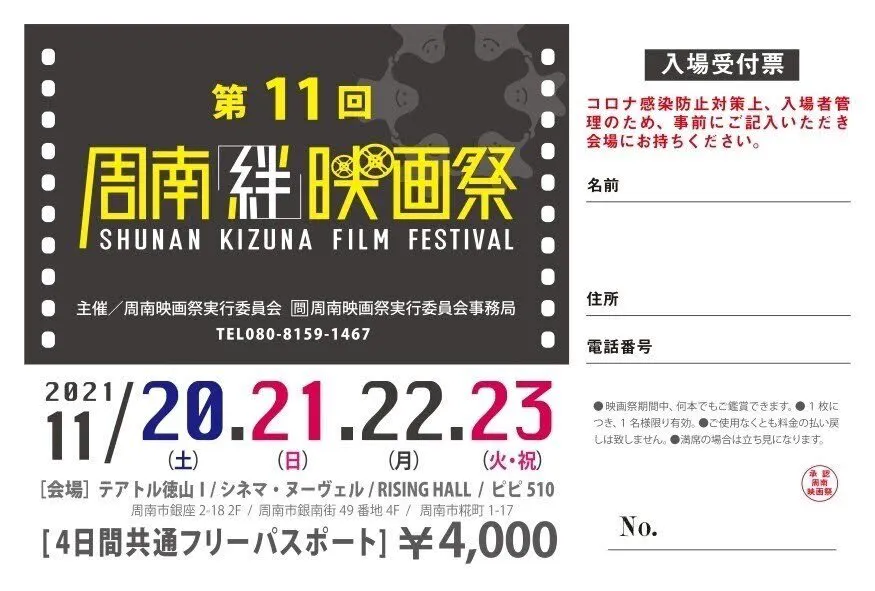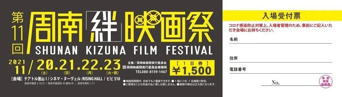 僕たち周南映画祭実行委員会は、そんな「映画」への想いを、山口県周南市から全国、世界に届けるとともに、この地域を元気にしたい、そしてその元気を全国や世界に発信したい、と周南「絆」映画祭の開催を企画し、今年で11回目を迎えました。