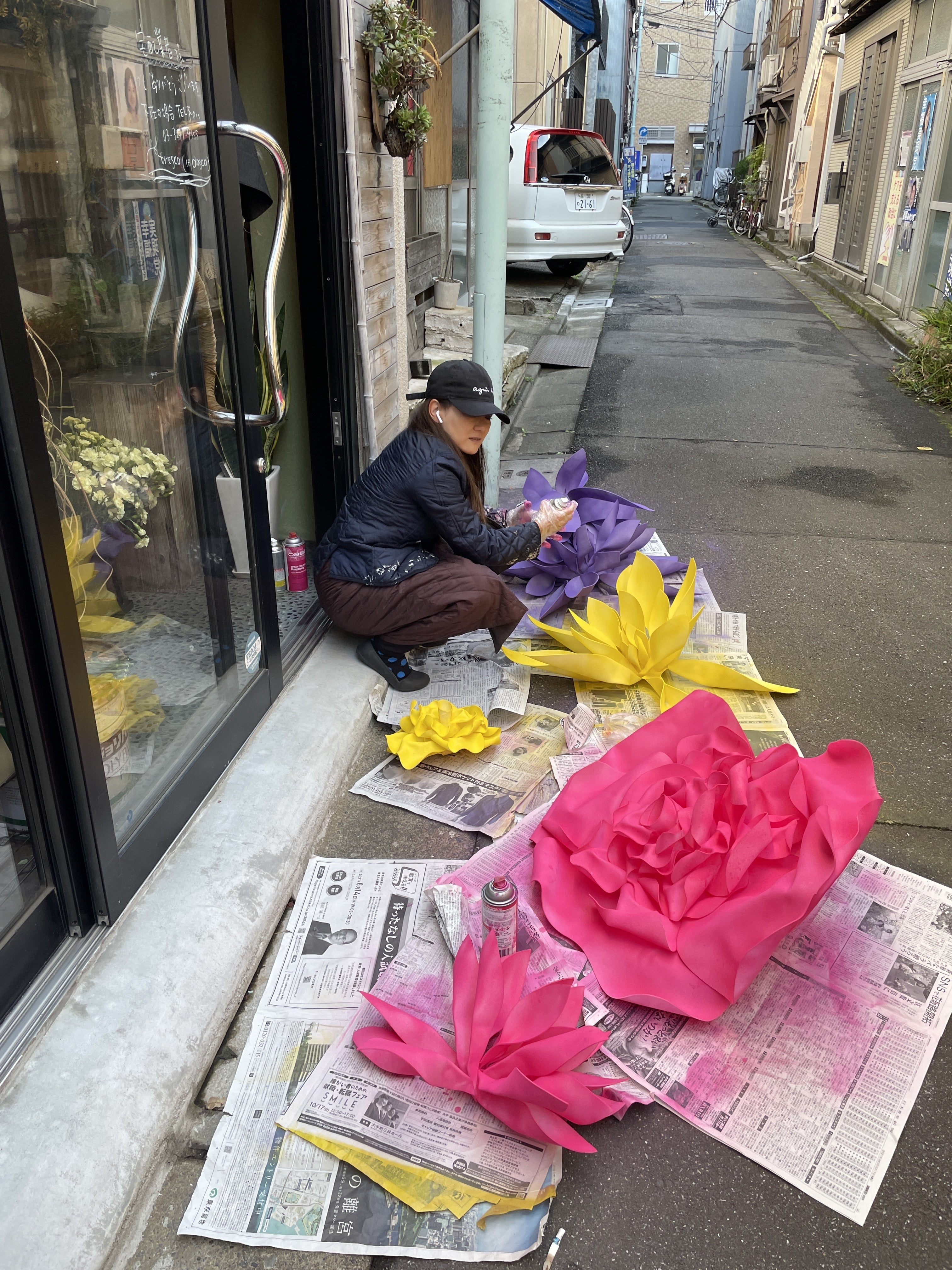 大きなお花は、リブリメントフラワーと呼んでいるオリジナルのジャンボ花です。リブリメント(自由自在)という名の通り、大きさも形も様々に創作できます。秘密の素材で出来ており、軽くて丈夫で!紙と違って破れないし、なんと水に濡れても大丈夫!!という優れもの。