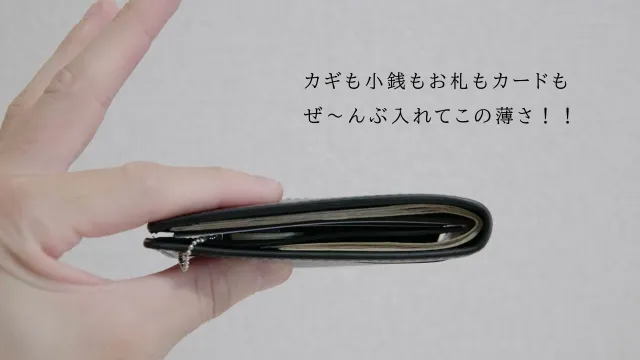 カギ1個、小銭15枚、お札10枚、カード4枚いれてこの薄さ。