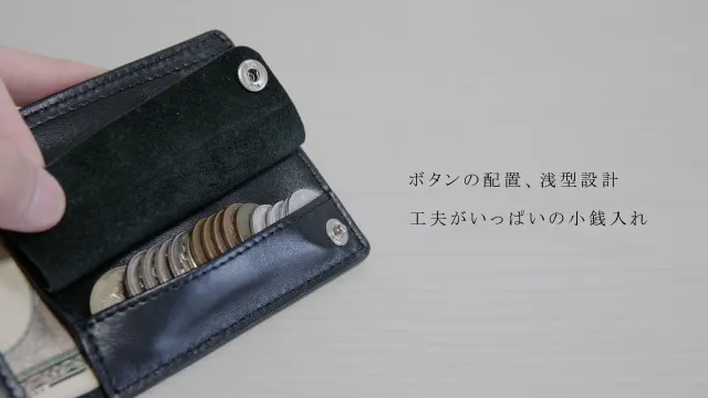 小銭を入れても膨らみが少ないように革の厚みやボタンの配置を工夫しました。