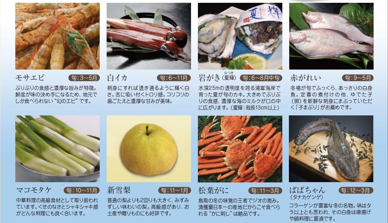 さらに、自然食材も豊富で、夏には牡蠣や白イカ、秋には二十世紀梨、冬には松葉ガニやばばちゃんなど、年中を通して美味しい食材を味わうことが出来ます。